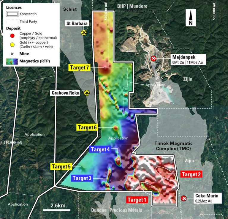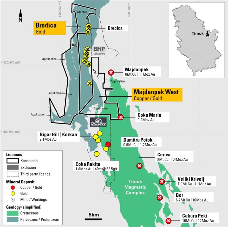 Konstantin’s Majdanpek West target area (comprising the Majdanpek West and Majdanpek Pojas licence applications) encompass a part of Timok Magmatic Complex (TMC) and associated lithologies, which host multiple world-class mineral deposits in the region.