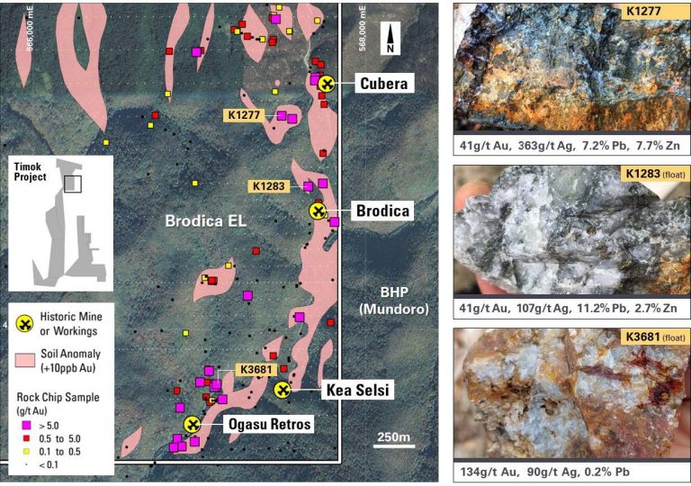 - Sample K1277: 41g/t Au, 363g/t Ag, 7.2% Pb, 7.7% Zn (subcrop)